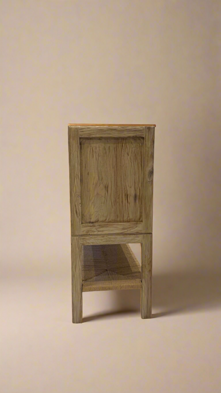 The Cabana Storage Buffet pairs solid teak with woven fibre doors, creating a facade that is both tactile and refined. When closed, the doors merge seamlessly into the design, allowing the natural grain and texture to take focus. Inside, ample storage is concealed with quiet elegance, making the piece as practical as it is striking.