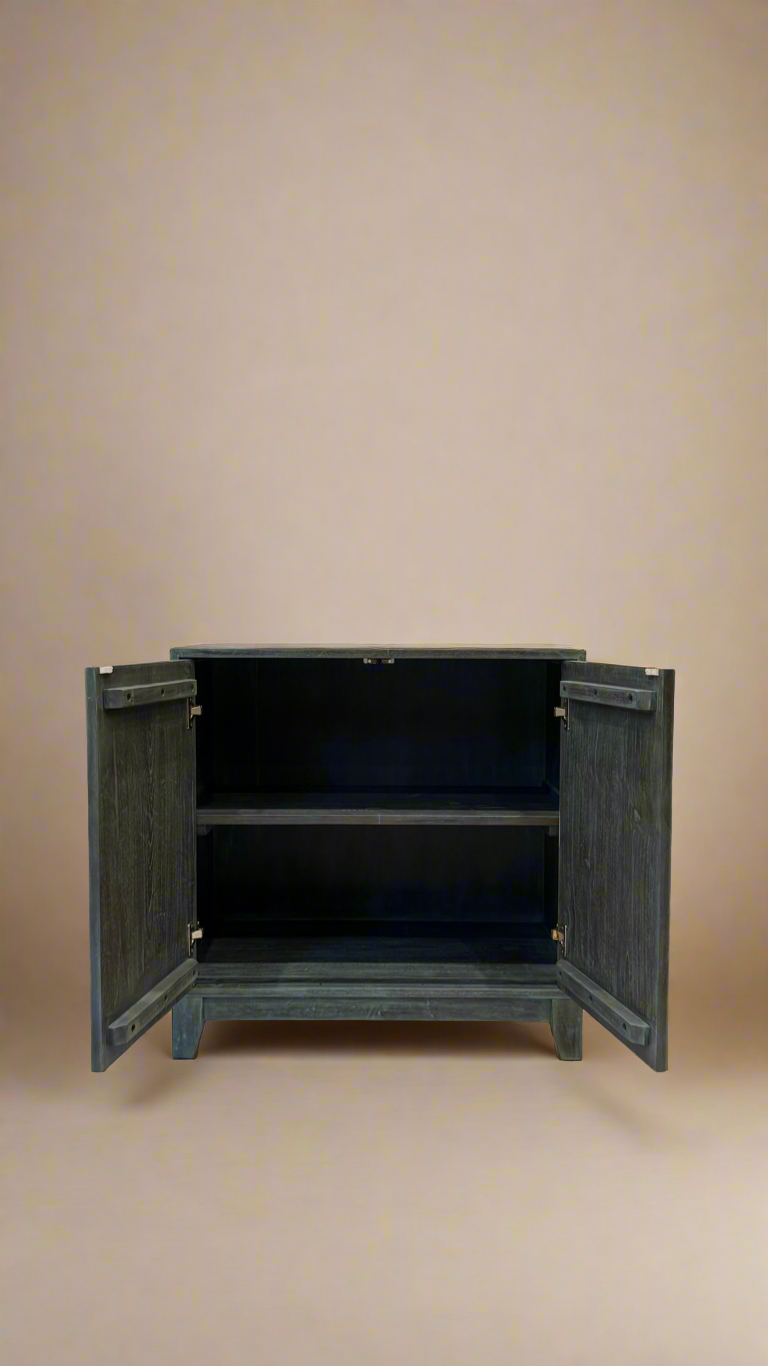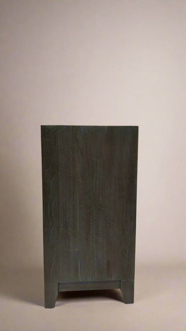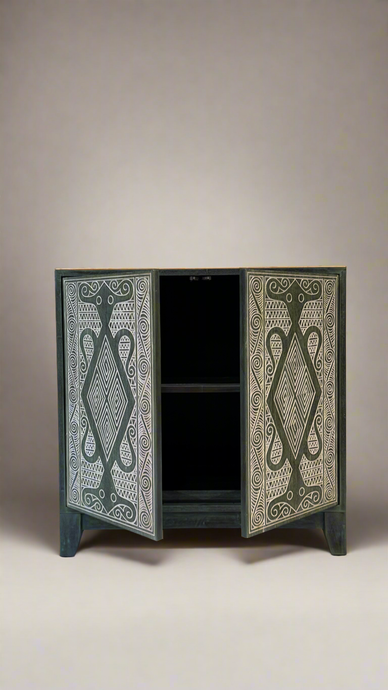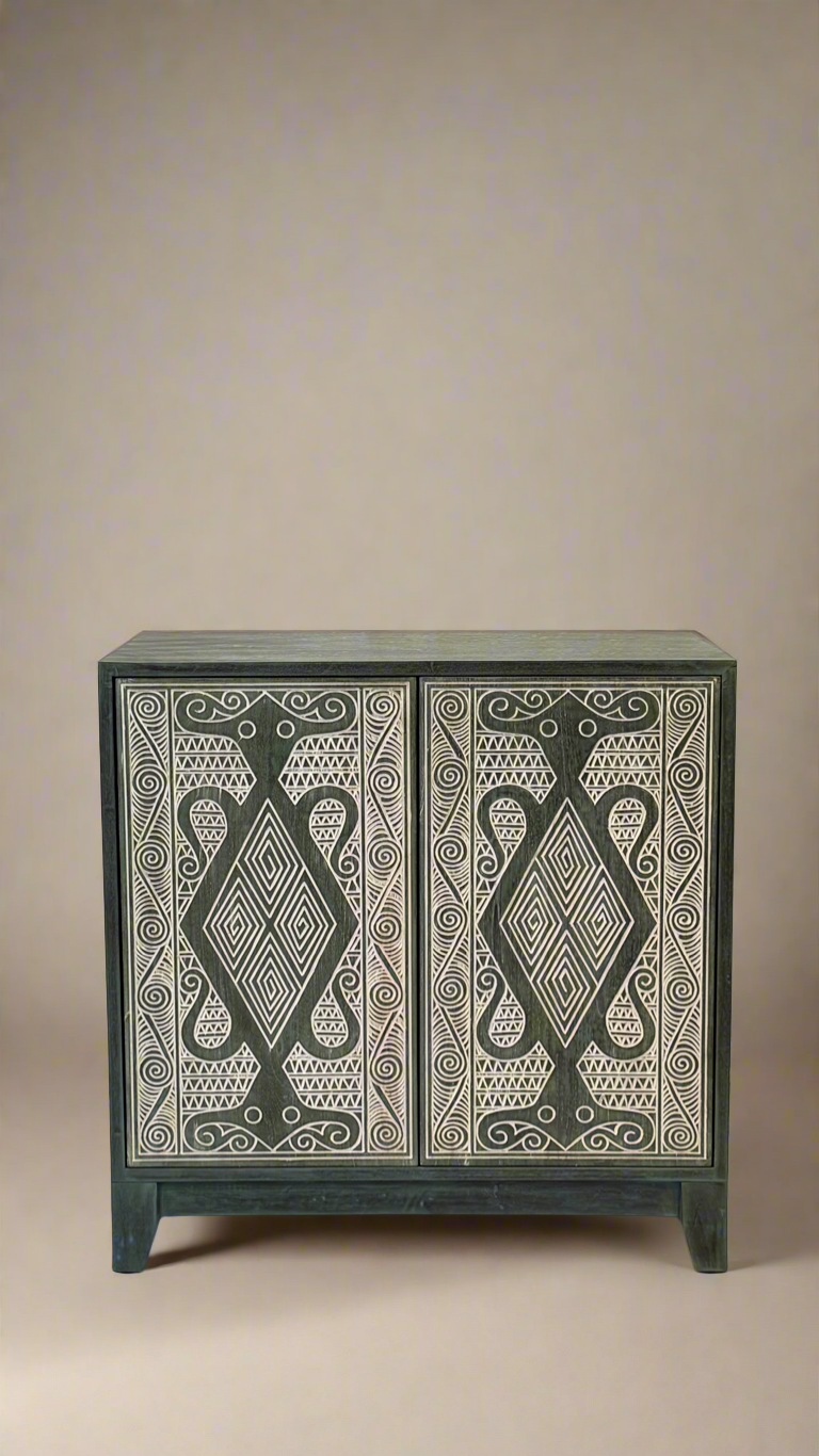 Crafted from teak wood with a green-washed finish, the Carmele Buffet features intricately carved doors, their white-painted detailing tracing patterns that catch the light and create rhythm across the surface. The textured carvings and bold contrast draw the eye, while the compact form conceals generous storage within. A piece where craftsmanship, colour, and sculptural presence come together in enduring harmony.