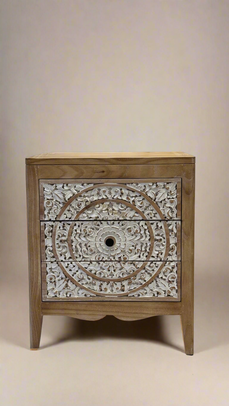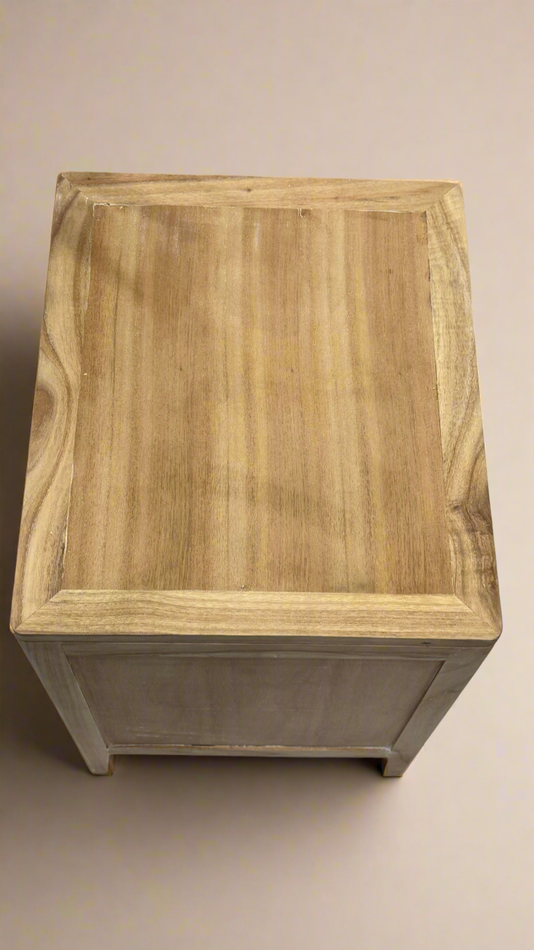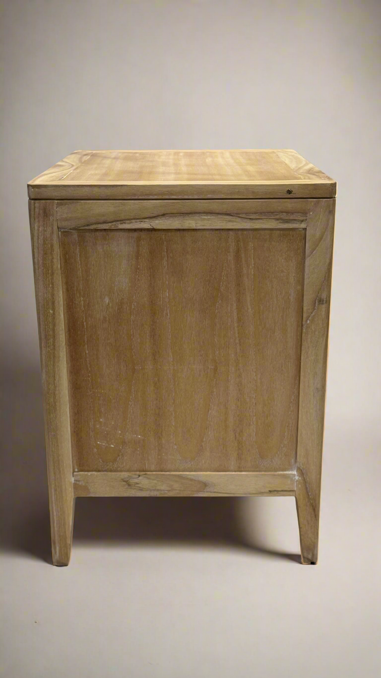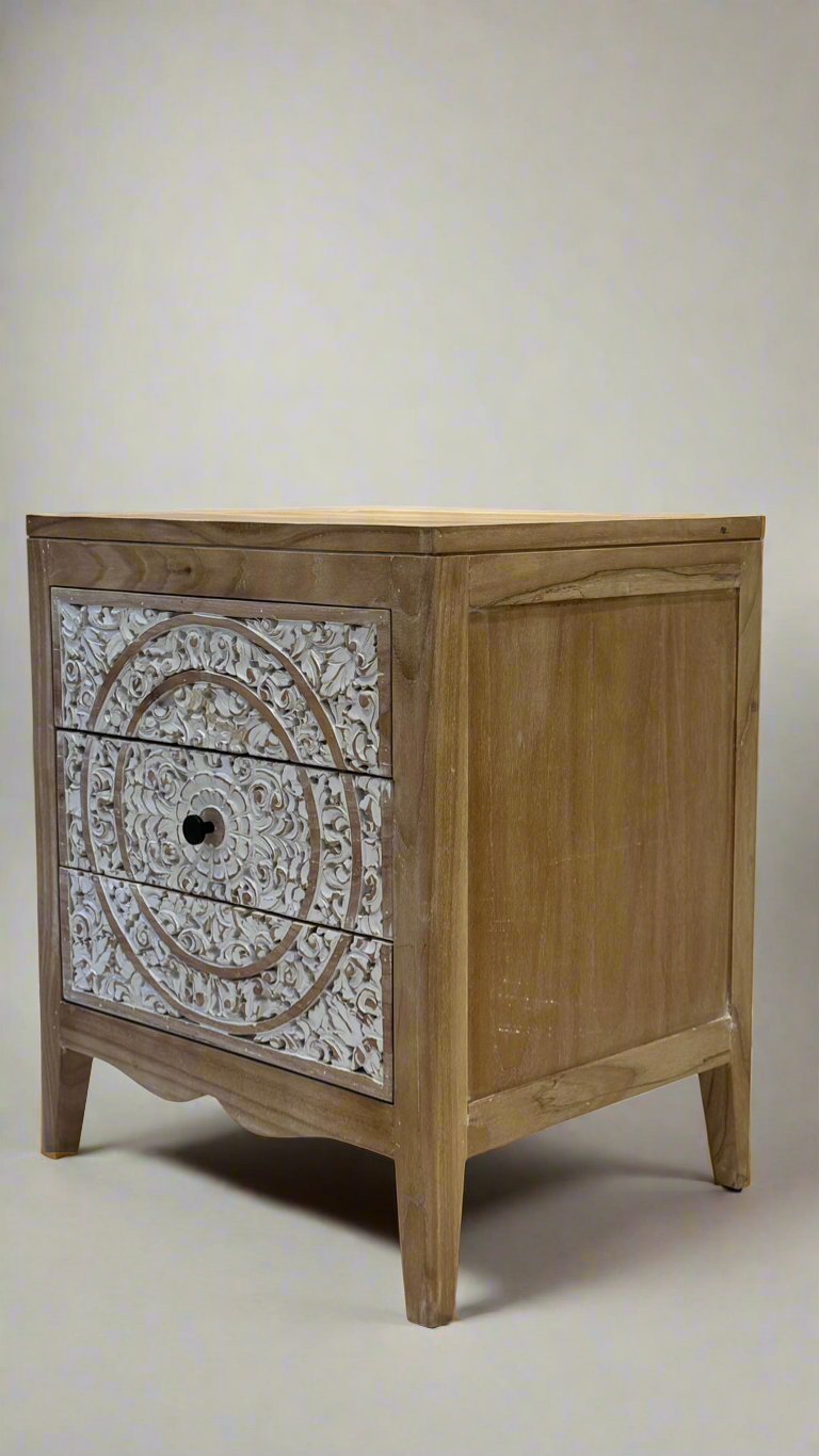 Crafted from teak wood with a white-washed finish, the Daisy Side Drawer features carved fronts that trace subtle patterns and rhythm across its surface. Compact yet sculptural, the piece brings style and presence, while its tactile detailing and gentle proportions add warmth and character to any space.