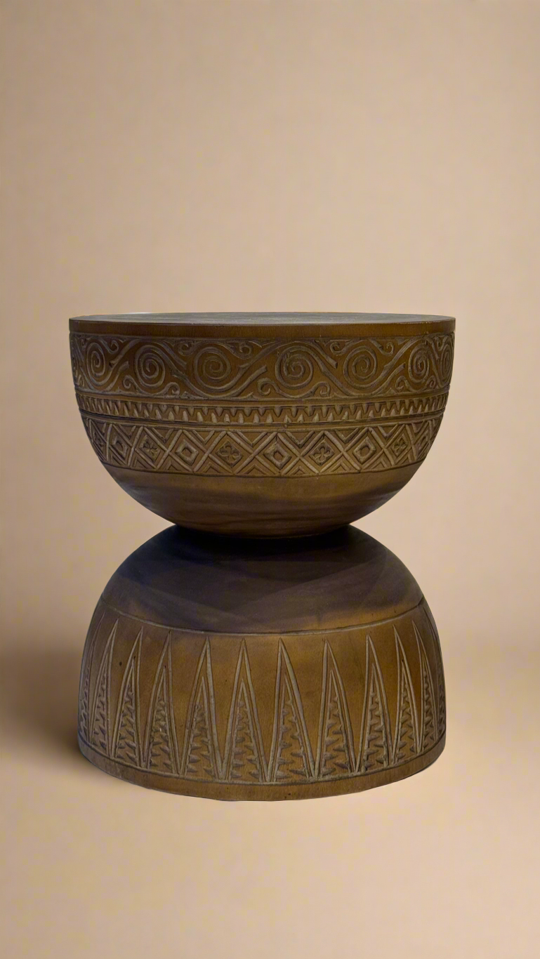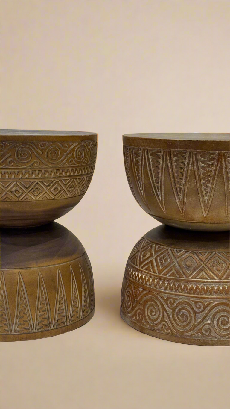 Carved from solid teak, the Hourglass Side Table narrows at its centre, its mirrored curves forming a sculptural silhouette that captivates the eye. Delicate carvings on the semicircular stumps trace a subtle rhythm, while the natural grain of the wood adds warmth and tactility. A piece that balances form, presence, and texture with enduring appeal.