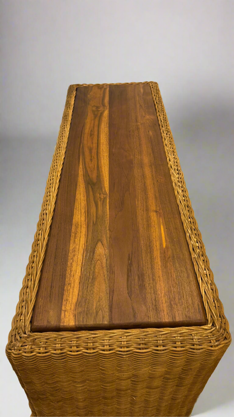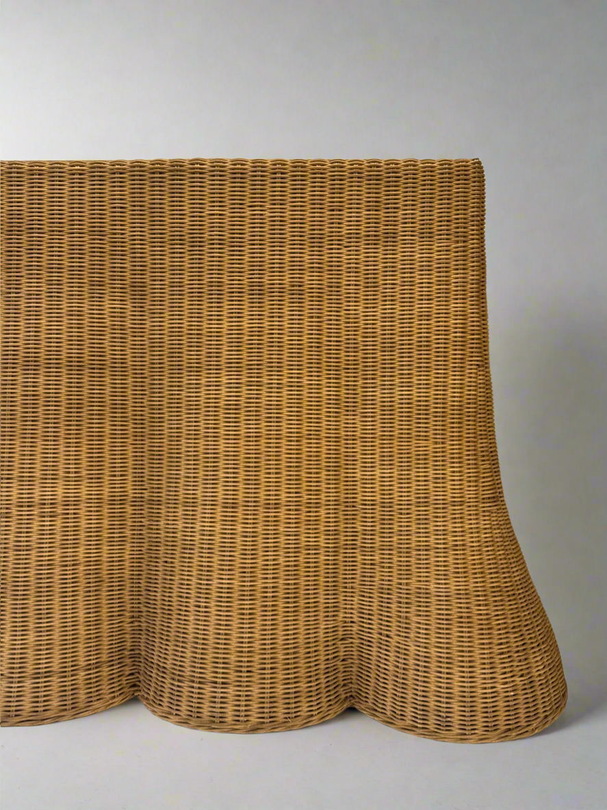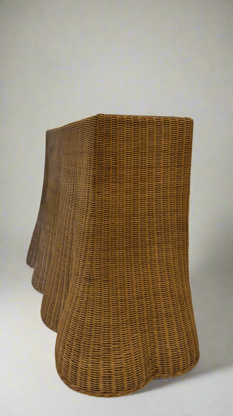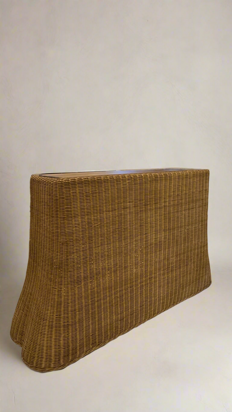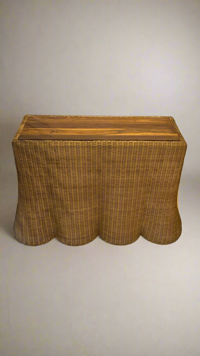 The Nevada Console is defined by its ondulated rattan weave and gently scalloped edge, creating movement, texture, and subtle rhythm across its surface. A teak top grounds the form, while the woven body introduces tactility and lightness, resulting in a composition that feels both refined and inviting.